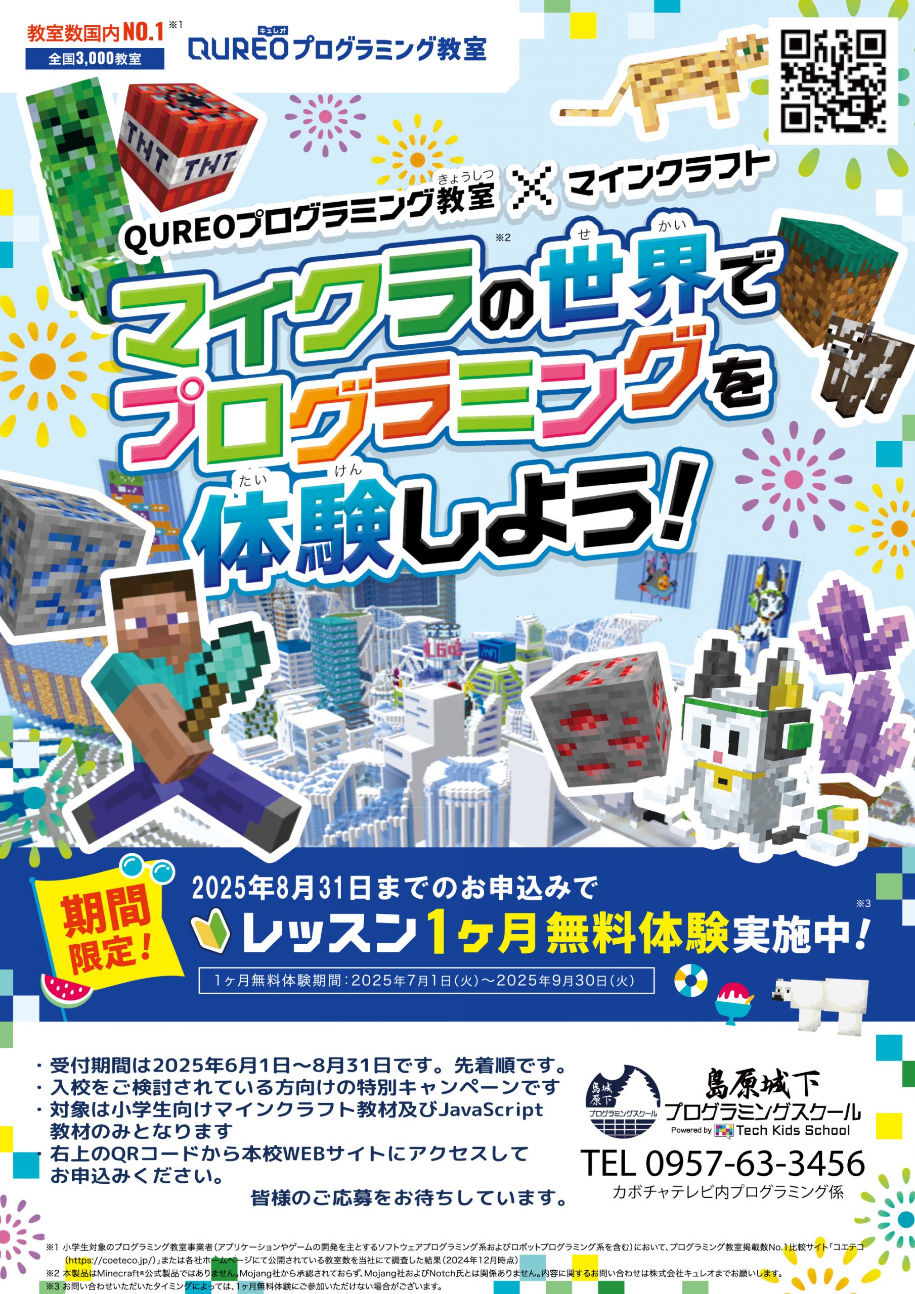 2025年7月~9月の期間、小学生向けマインクラフトクラスの無料体験を行います。